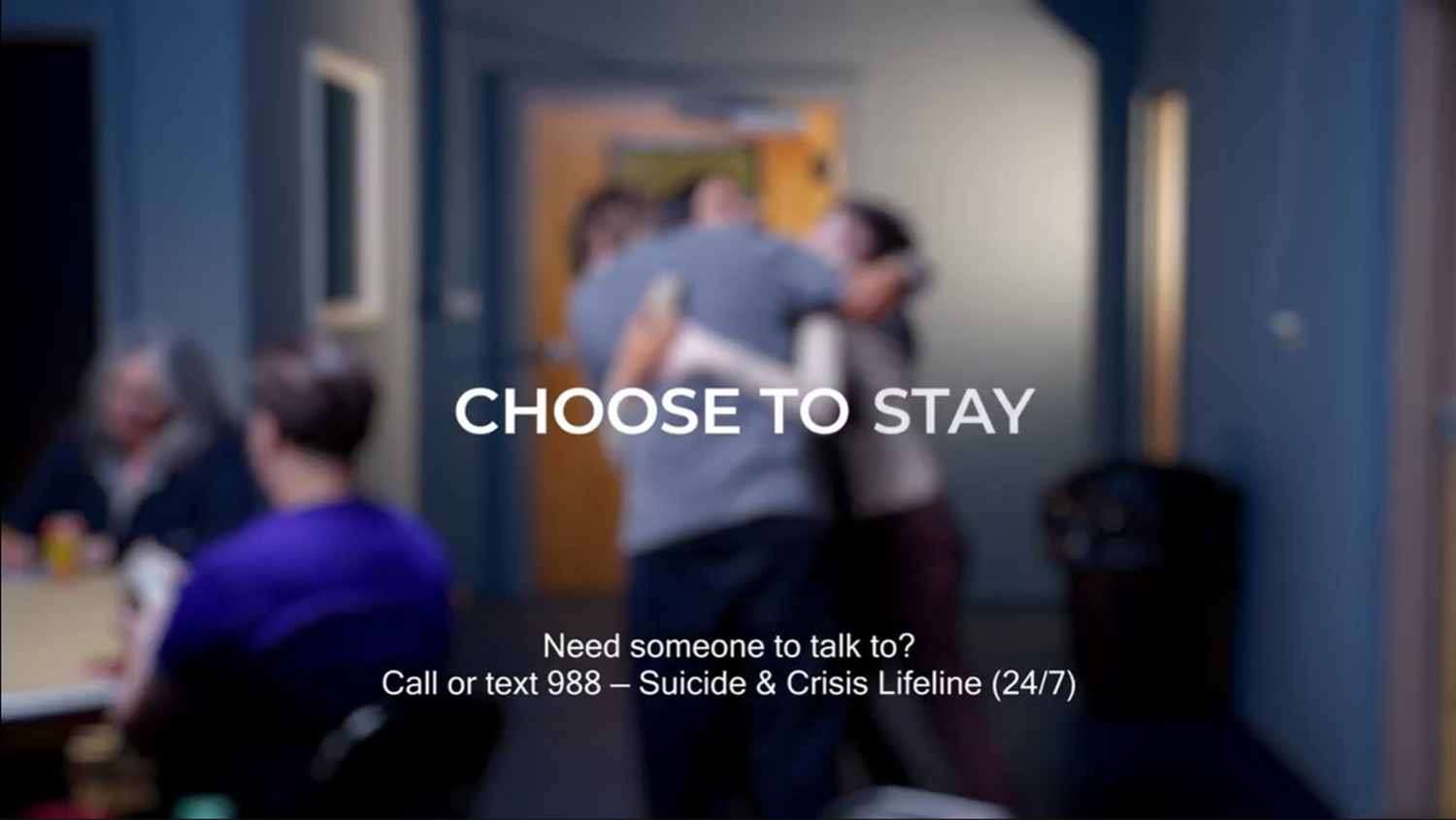 In the video, which runs just over a minute, a teenage boy approaches friends at a lunch table and laughs that he'd made his last "F" in school, implying he'd end his life. In the next scene, a young woman who had been at the table — Haines — contemplates a suicide note she'd written to her mom. In the following scene, the friends — including the boy who had received the failing grade — worry about where Haines is. She approaches them and, relieved to see her, they embrace her. This message appears on screen: "Choose to Stay." Afterward, a screen lists resources for those with mental health challenges.