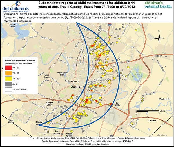 Dell Children's researchers also worked with geographic information system experts at Children's Optimal Health to create maps showing trends in child maltreatment and areas most affected by child abuse.