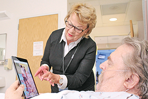 A volunteer visits patients in inpatient units, asking them whether they would like different art prints in their rooms. The volunteer comes prepared with a dedicated iPad, loaded with photos of all of the artwork that is available, and a cart with a selection of framed prints.