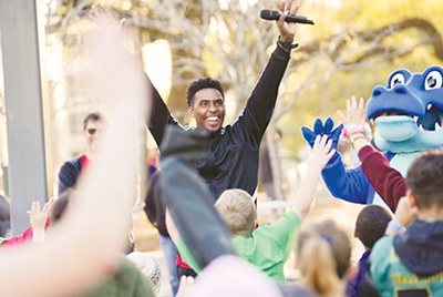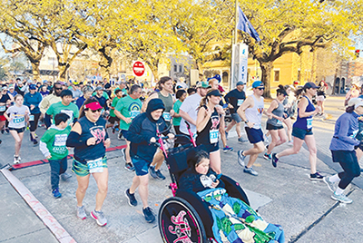 A crowd of 1,112 runners, walkers and wheelchair users took to the streets of downtown Baton Rouge, Louisiana, for Our Lady of the Lake Children's Health Eighth Annual Amazing Half Marathon, 5K and One-Mile Family Fun Run on March 4. The focus of the event is on encouraging children and families to develop a lifetime of healthy habits. Our Lady of the Lake is part of the Franciscan Missionaries of Our Lady Health System. Clockwise from left: Destin Ware is cheered across the finish line by Danny Hyunh, a volunteer with Ainsley's Angels of America, an organization dedicated to inclusivity in endurance events. Adrian Brumfield, health educator at Our Lady of the Lake Children's Health, leads a warmup for young racers along with Dash, a big blue gator who is the event's mascot. A throng of participants charges across the starting line as the event begins.