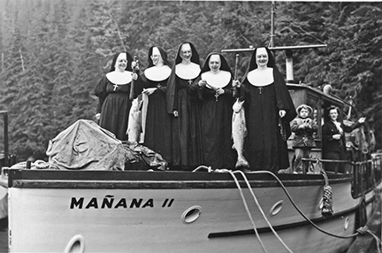 Sisters of St. Joseph of Peace show off their catch in Loring, Alaska, in the late 1950s.