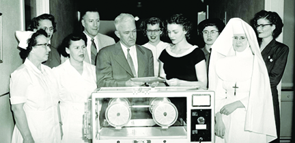 In 1953, members of the Ketchikan chapter of the Beta Sigma Phi social organization present a new incubator to representatives of the city and the hospital.
