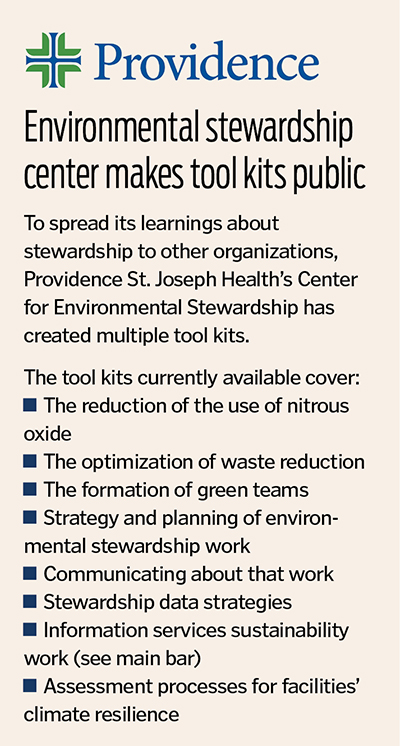 When implementing environmental stewardship programs in 51 hospitals and more than 1,000 outpatient sites across seven states, such large-scale accomplishments are possible. Providence St. Joseph Health has had such success with its energy-saving, waste-reducing, cost-saving and other environmental strategies that it wanted to help other organizations achieve similar results. It has created the Information Services Environmental Stewardship Toolkit to share practical ways to use technology to achieve important goals.