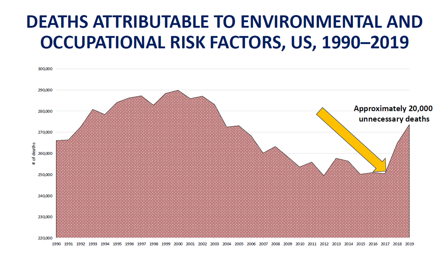 After the first Trump administration ended, Landrigan was among several researchers who co-authored a report published in February 2021 in The Lancet medical journal on the impact of the administration's policies. One finding was that the pullback of environmental regulations caused more than 22,000 unnecessary deaths in 2019 alone. Those deaths were from health conditions brought on or worsened by environmental factors and of workers who succumbed to occupational diseases, such as coal miners who died of black lung.