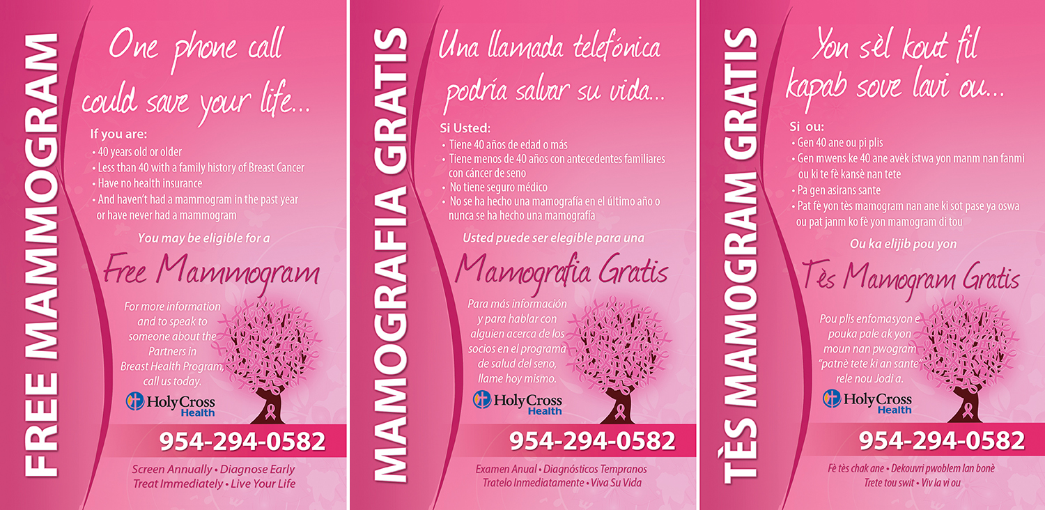 The card, printed in English, Spanish and Creole, explains how women in Broward County, Florida, who meet the program’s eligibility requirements can call to make an appointment for a free mammogram. The Holy Cross Health’s Partners in Breast Health program is part of the system’s community health and well-being department, which works to improve health equity. Screening and diagnostic services are provided at the Holy Cross Dorothy Mangurian Comprehensive Women’s Center in Fort Lauderdale. Holy Cross Health is a member of Trinity Health.