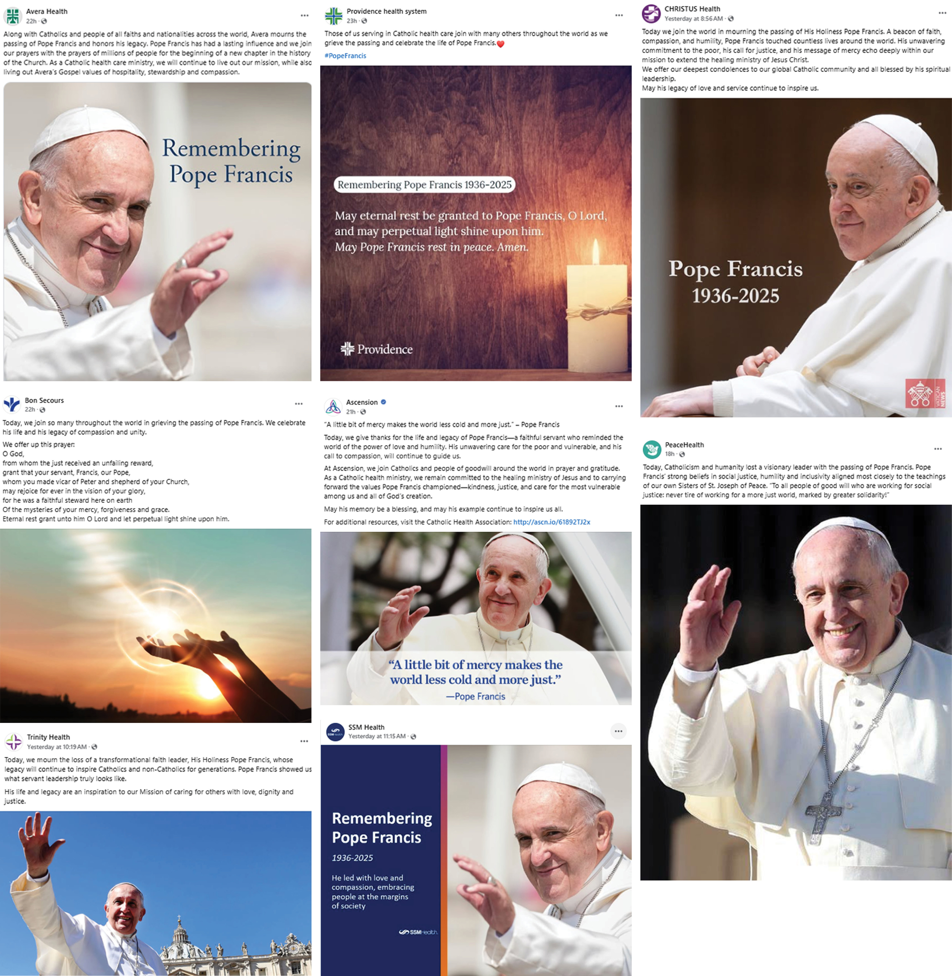 Providence St. Joseph Health President and CEO Erik Wexler also commented on social media, noting that the pope “will be remembered for numerous contributions, especially his outreach to those who are poor and vulnerable, advocacy for responding to climate change, and a deep commitment to health care.”