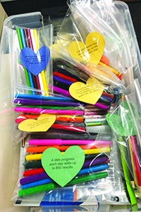 They settled on a plan to assemble two types of gift packets. One is a game pack that includes a word search, crossword or Sudoku puzzle, a deck of cards, a spot-the-difference challenge and pencils and pens. The other is a craft pack with an adult coloring book, crayons, sketch paper, colored pencils and watercolor paints.