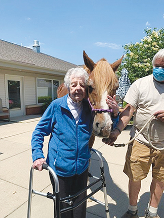 Casey Bakewell, activities director, often accompanies Mowry and his horses as they make their rounds on their Benedictine visits. She speculates that because many of the residents grew up on farms