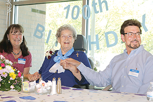 Sr. Mary Maurita Sengelaub, RSM, celebrates her 100th birthday June 28 at the Mercy Life Center in Farmington Hills, Mich. A nurse, hospital administrator and advocate for health care services for migrant workers, Sr. Sengelaub was the first woman religious and non-cleric to head CHA, a responsibility she held in the early to mid-1970s. The CHA Board of Trustees commended her achievements during her six-decade plus career in health care with a resolution stating their appreciation. The board said her work influenced the ethical, legal and administrative structure of Catholic health care today. Sr. Sengelaub is shown at her party flanked by her cousins Suzanne Ernest and Steven Voelker.
