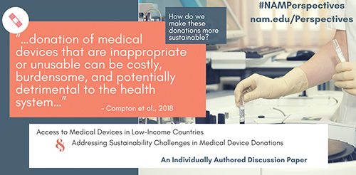 Interested members formed a work group to write a perspectives paper, with Compton as lead author. Their work product, "Access to Medical Devices in Low-Income Countries: Addressing Sustainability Challenges in Medical Device Donations," was published online by the National Academy of Medicine on July 16. It is available at https://nam.edu/access-to-medical-devices-in-low-income-countries-addressing-sustainability-challenges-in-medical-device-donations/#NAMPerspectives.