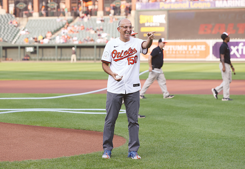 Dr. David Maine, president and CEO of Mercy Health Services of Baltimore, throws out the ceremonial first pitch at the Aug. 15 Baltimore Orioles home game. His appearance was connected with the celebration of the 150th anniversary of Mercy Medical Center, which is part of Mercy Health Services.