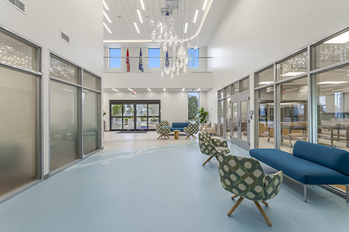 Soothing ocean-themed artwork and frosted glass doors in the new clinic lend airiness and privacy. One multifunctional space has different seating options, including rockers, gliders, couches, and high-top tables to accommodate diverse needs and preferences.