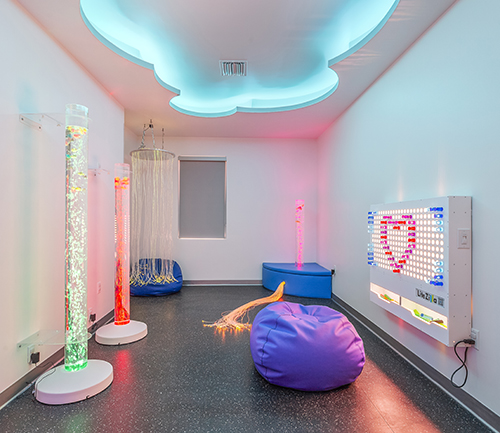 A low-stimulation room, for children to calm themselves or relax for therapy, includes a custom ceiling with a cloud-shaped cutout that can be lit in different colors. Children can play with thin strands of rope lighting or a light-up pegboard or watch bubbles and small toy animals floating in bubble towers.