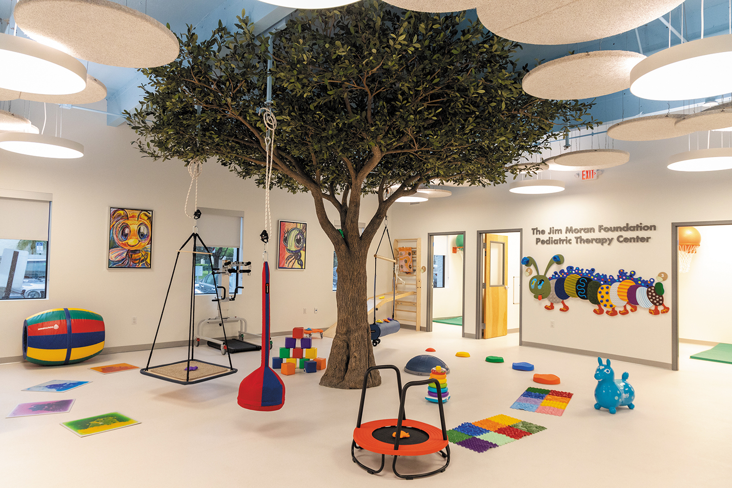 A pediatric therapy center includes equipment for children to work on motor skills. A tree centered in the room has swings hanging from its branches. Schroeder-Brown's 4-year-old son comes to the clinic two hours a week for therapy to help with motor, speech and daily living skills and loves it.