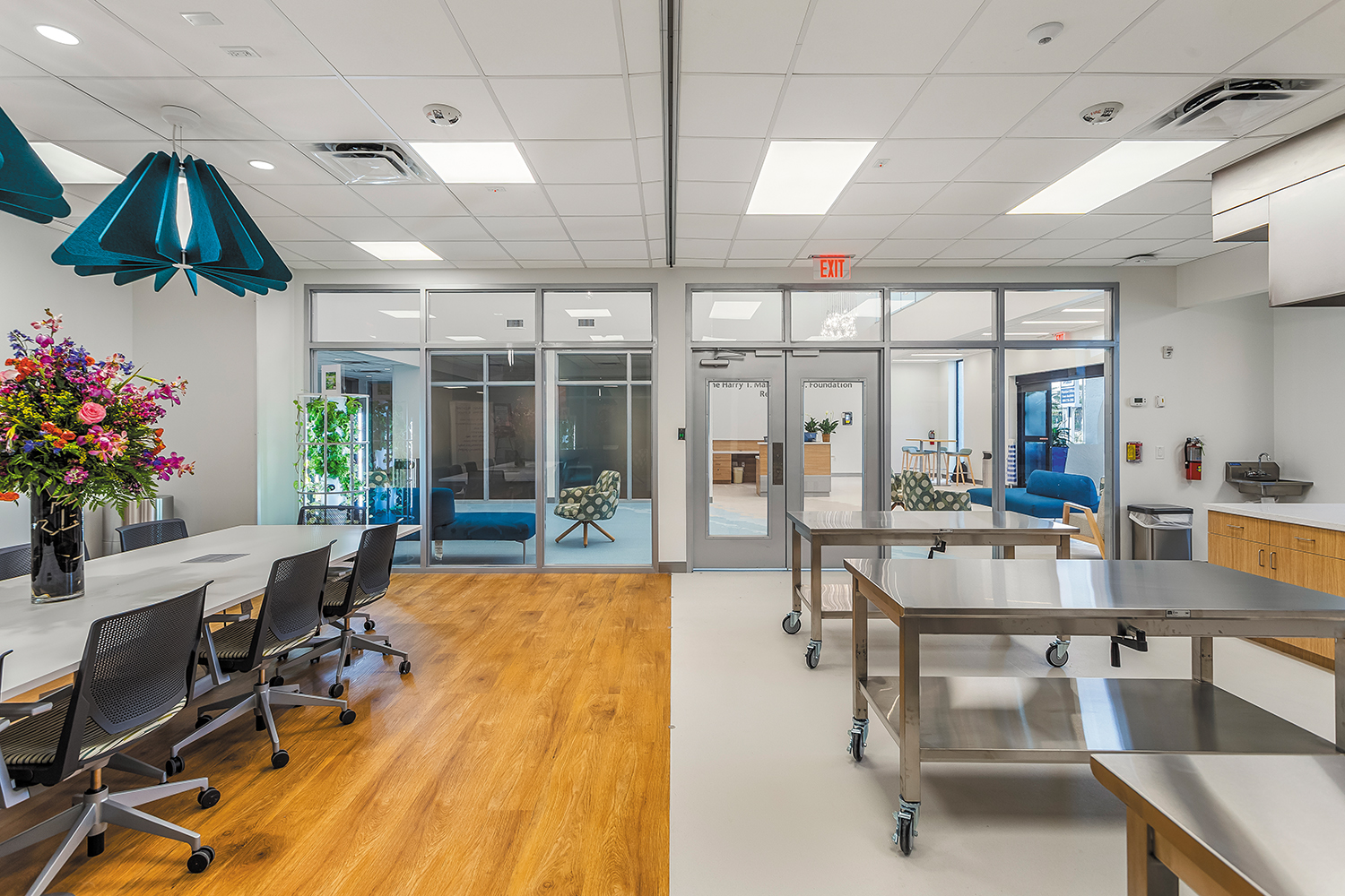 The center, made possible through $4.9 million in donations, includes 11 exam rooms, a teaching kitchen, a laboratory, a pediatric therapy center anchored by an indoor artificial tree with hanging swings, a low stimulation room for pediatric patients to calm themselves, office space for community health workers, and classroom and meeting spaces. In addition to primary care, wellness checkups and immunizations, patients can get medical nutrition therapy and access to culinary medicine to help them manage and prevent chronic diseases.
