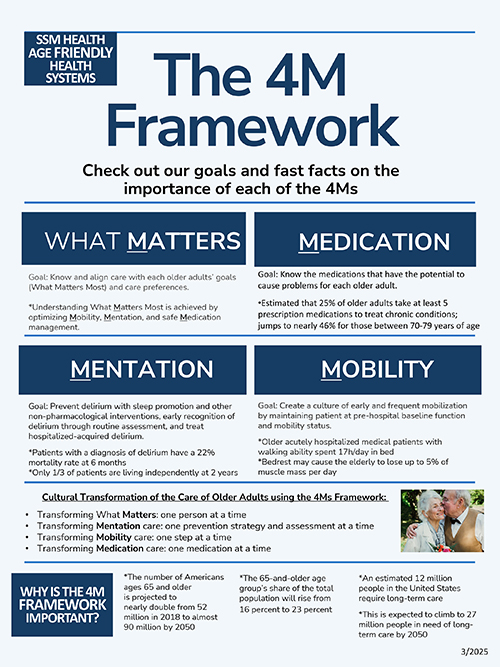 The age-friendly initiative hinges on providing holistic patient-centered care around the "4Ms Framework." The 4Ms are: medication, mobility, mentation and what matters to the patient.