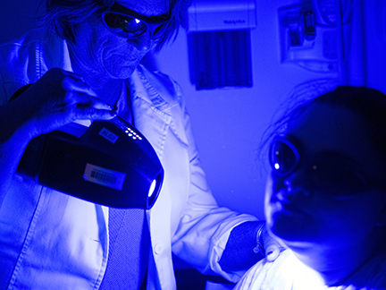 Holbrook, the hospital's director of forensic nursing, says the forensic nursing team, which was founded in 1994, was one of the first of its kind in the nation. When the team — officially the Forensic Nurse Examiners Program — began experimenting with the alternate light unit as they examined victims of violence, they found it could be used to detect injuries hidden by skin color and those that left no marks on the surface of the skin.