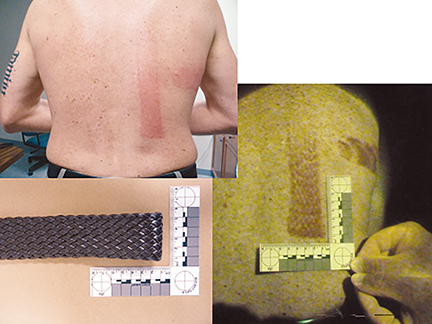 This type of unseen injury was known to be the norm in strangulation cases when the weapon is the hands, Holbrook says, because choking involves one broad surface, the hands, applying force on another broad surface, the neck. The force of the pressure is so dispersed that the injuries are below the skin, or dermal, level. Those injuries are visible, however, when the patients are examined with alternate light. Holbrook says exactly which wavelength will expose the damage depends on the depth of the injury, skin pigmentation and length of time since the assault.