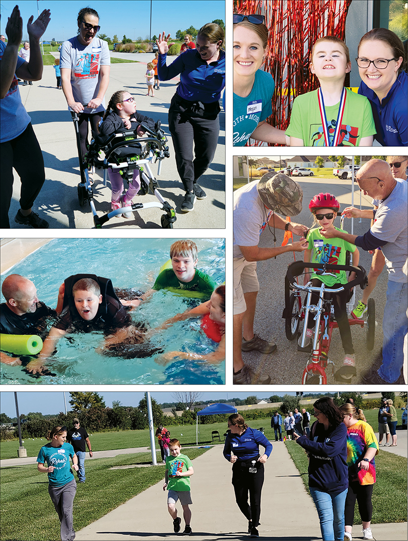 Seventeen children with physical challenges got a chance to experience the thrill of competition at the Meet Me at the Finish Line! Youth Adaptive Try-athlon sponsored by HSHS St. Anthony's Memorial Hospital in Effingham, Illinois. Athletes and their adult buddies splashed, pedaled and stepped through the race as a team. The hospital's physical rehabilitation and wellness team coordinated the event, held in late September at The Richard E. Workman Sports & Wellness Complex in Effingham. Many of the volunteers who supported the athletes were from HSHS St. Anthony's. Clockwise from top right: Megan Weichman, HSHS St. Anthony's physical therapist, left, athlete Dalton Hildebrand, and Rose Borries, HSHS St. Anthony's occupational therapist, are all smiles after Dalton got a medal, as all the athletes did. Scott Bales, left, and Tony Feeler, volunteers from the nonprofit AMBUCS, help athlete Olivia Clayton get ready for her ride on an adaptive bicycle. With Dalton's mom, Kristy Hildebrand, right, recording, Weichman and Borries accompany the youngster on the running leg of the event. Jon Lankow, left, HSHS St. Anthony’s physical therapy assistant, volunteer Braden Magelitz, and Erica Magelitz, HSHS St. Anthony's physical therapist, encourage Steven Cook on his swim. Jennifer Wagner, HSHS St. Anthony's clinical educator, pushes athlete Adelaide Hastings, as Borries cheers them on.
