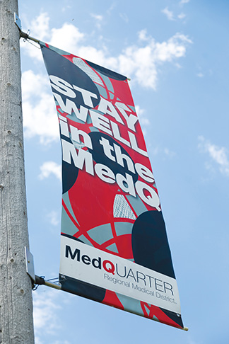 Some of the most visible evidence of the MedQ's work is the ubiquitous branded street signs and wayfinding posts. Also, the MedQ has worked hand in hand with the city to beef up and enforce building codes that promote