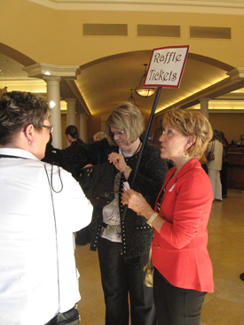 A staff member of Sartori Memorial Hospital's gift shop peddles raffle tickets at the "Holly Day Luncheon & Style Show" at the Festival of Trees supporting the Sartori Healthcare Foundation of Cedar Falls, Iowa. | |