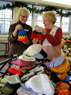 Residents of Laurel Lake Retirement Community in Hudson Ohio, admire caps knitted for needy kids by fellow residents and staff. | |