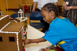 A patient decorates a gingerbread replica of SSM Cardinal Glennon Children's Medical Center in St. Louis. | |