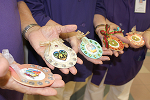 Volunteers and staff at the six hospitals of CHRISTUS Spohn Health System in south Texas paint and decorate about 600 ornaments. They gather in groups, sometimes painting the wooden disc-shaped ornaments during lunch hours in early December. They paste on a seasonal image, and finish the ornaments with faux jewels, glitter or other shiny accents.