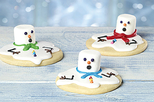 Melted snowman cookies Recipe submitted by Dignity Health Dominican Hospital, Santa Cruz, Calif. 1 dozen baked sugar cookies Spread white cookie icing on sugar cookies to resemble melted blobs. Decorate marshmallows with black cookie icing to make dots for eyes and a smile, or expression of surprise. Insert an orange jimmy into the marshmallow for a nose. Place angular cut of marshmallow on white icing puddle adding more icing around the snowman's neck (base of the marshmallow) to secure it. Push mini M&M's into cookie icing for buttons and add chocolate jimmies for arms.