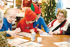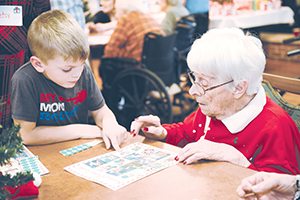 Tobias Ruppel, center left, and his cousin Brody Watson review bingo cards with Jackie Serene, left, and Lois Parrish, right, during the Berns Twins Memorial Christmas Party for residents and staff of Presence Merkle-Knipprath Countryside, a long-term care facility in Clifton, Ill. The party was Dec. 2. Amy Smith / © CHAEntering its 18th year, what is now known as the Berns Twins Memorial Christmas Party is named for Anderson's mother, Rell Yohnka and aunt, Christine Dubuque — twin sisters who lived at the long-term care facility until 2006, when both died within several months of each other. (Berns was the sisters' maiden name.)
