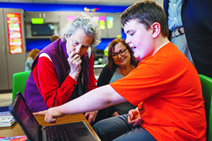 Kylan West, a student at Treffert Way for the Exceptional Mind, a charter school in North Fond du Lac, Wis., describes his computer project to Temple Grandin and Meg Puddy, center, during Grandin's October tour of the school. Puddy is a board certified behavior analyst at the Treffert Center.