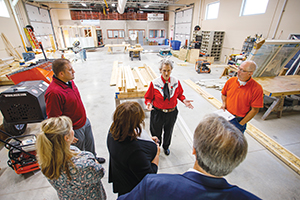 Grandin tours an industrial arts classroom at Fond du Lac High School where students, including people with autism, learn skills used in construction trades. Listening to Grandin are representatives from the school and from the Treffert Center.