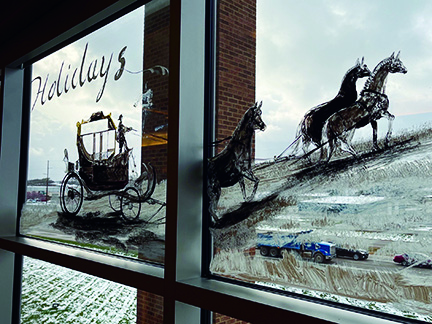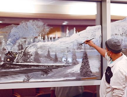 Artemio Huerta created a winter scene, including a horse-drawn carriage, on windows in a waiting room at SSM Health Dean Medical Group's east Madison, Wisconsin, clinic.