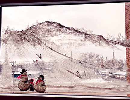 Over the course of about two weeks in mid-November, Huerta spent several hours a day adorning the second-story windows with a panorama of snow-covered hills and ice-laced evergreens. There's a horse-drawn carriage, a snowman family, snow children snowboarding, a steam locomotive rounding a bend and a cluster of cozy lakeside cottages.