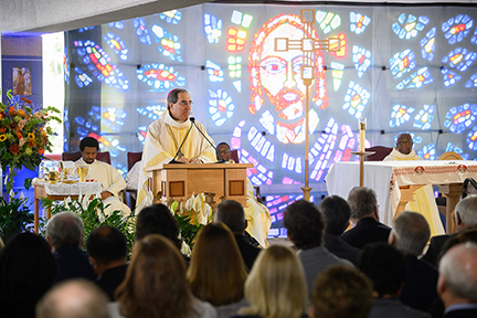 Baton Rouge Bishop Michael Duca celebrated the Mass. Leaders and staff of Our Lady of the Lake and its parent Franciscan Missionaries of Our Lady Health System attended, along with members of the system's founding congregation the Franciscan Missionaries of Our Lady.