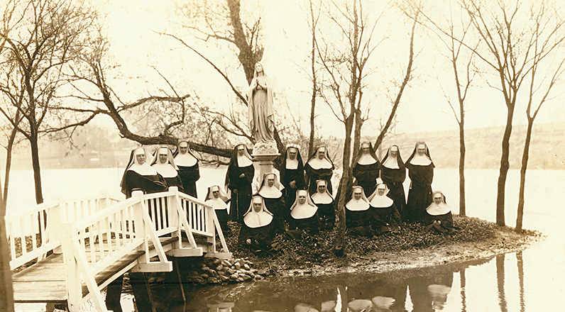 Franciscan Missionaries of Our Lady sisters gather in 1923 on an island on the grounds of Our Lady of the Lake Sanitarium. The island with a statue of Our Lady was on Capitol Lake in downtown Baton Rouge, Louisiana. The FMOL Sisters often reflected and prayed on the island.