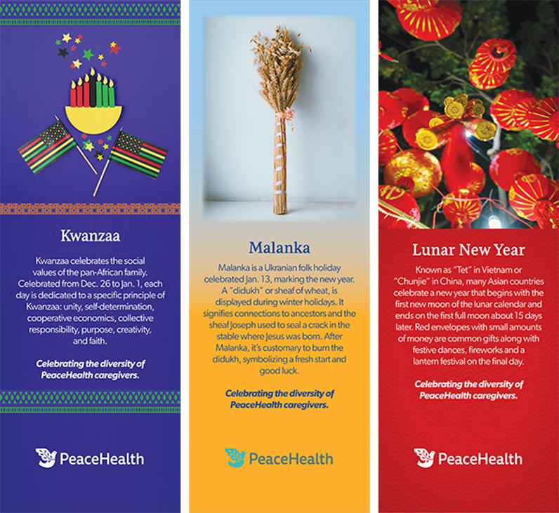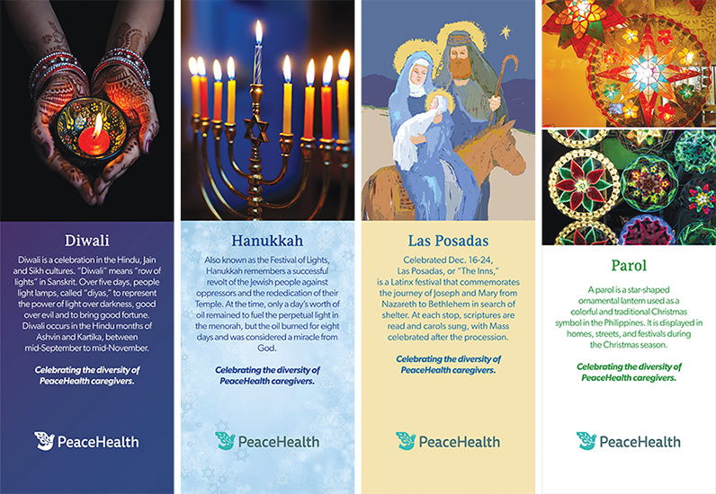These are four of the seven banner themes that PeaceHealth has created as part of its Winter Traditions campaign. The campaign highlights some of the customs and celebrations of different populations that PeaceHealth serves.