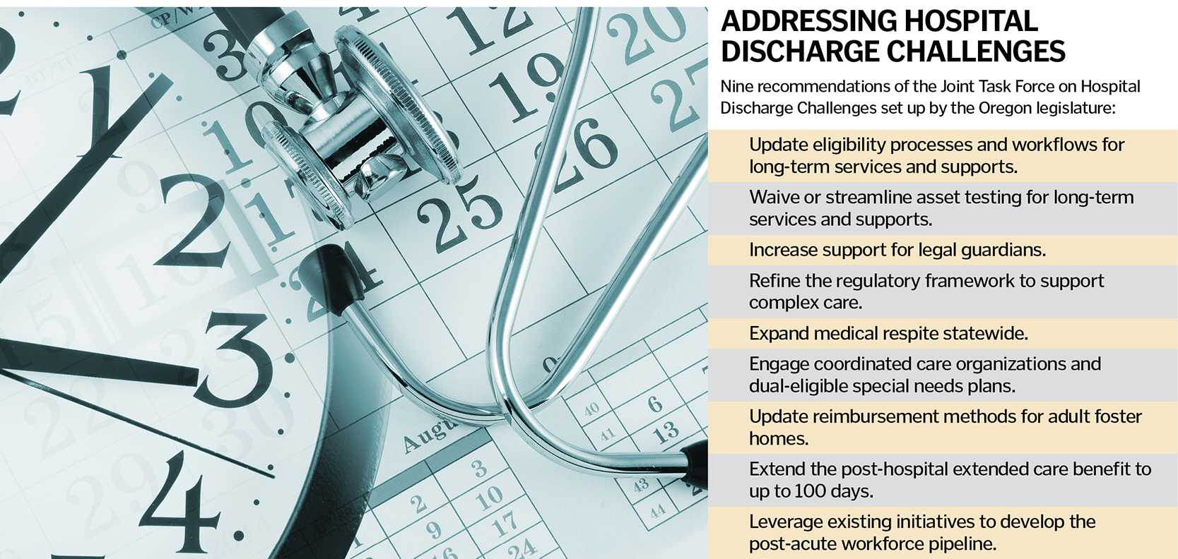Another recommendation that I think will be impactful is having Oregon Health Plan (the state's version of Medicaid) increase skilled nursing coverage from 20 days to 100. That would capture many patients who are kind of stuck.