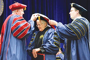 During a Jan. 16 commencement, Sr. Sharon Holland, IHM, receives a hood from Br. William Mann, FSC, president of Saint Mary’s University of Minnesota, at left, and Timothy Gossen, vice president for mission at Saint Mary’s.