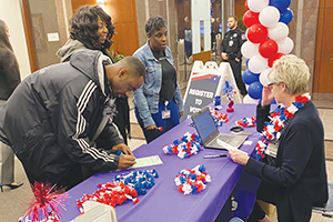 Sue Rosenbluth, an advocacy and public policy project specialist for CHRISTUS Health, registers voters at the system's headquarters in Irving, Texas, in January. Registration was open to staff and visitors.