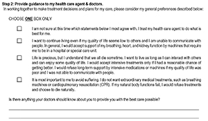 In the declaration, patients name a health care agent who they authorize to speak on their behalf if they lose decision-making capacity. Patients also check one of four boxes to provide guidance on their care preferences.