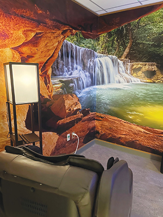Rebecca Inman, ER nurse manager, collected ideas for the rooms at Lourdes and has overseen purchases of furnishings. She and two colleagues hung the waterfall mural that covers one wall.