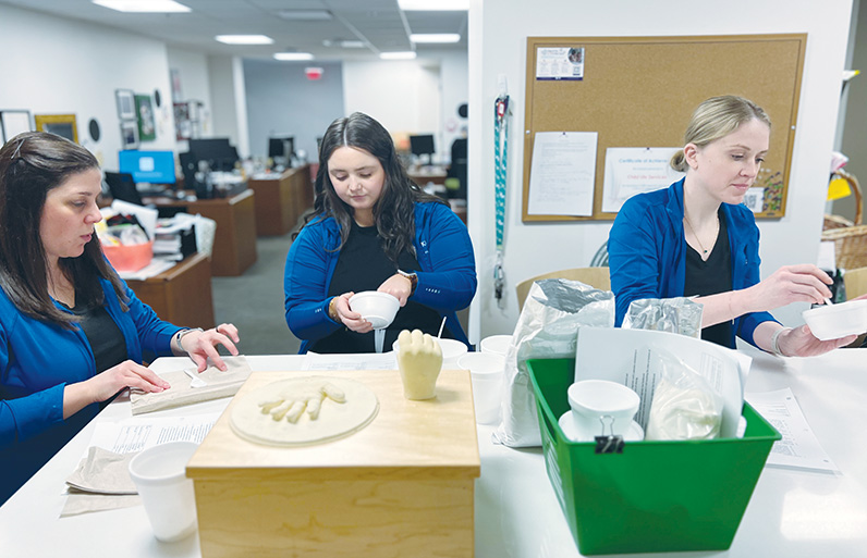 From left, Ashley Wilson, McKenzie Hansen and Lauren Dexter of Mercy Hospital Springfield in Missouri learn how to take hand and foot molds to create mementos of babies who have died or are dying. The molds are just some of the offerings for families experiencing the loss of an infant or child. Wilson, Hansen and Dexter are part of the Child Life services team at Mercy Springfield’s Mercy Kids.