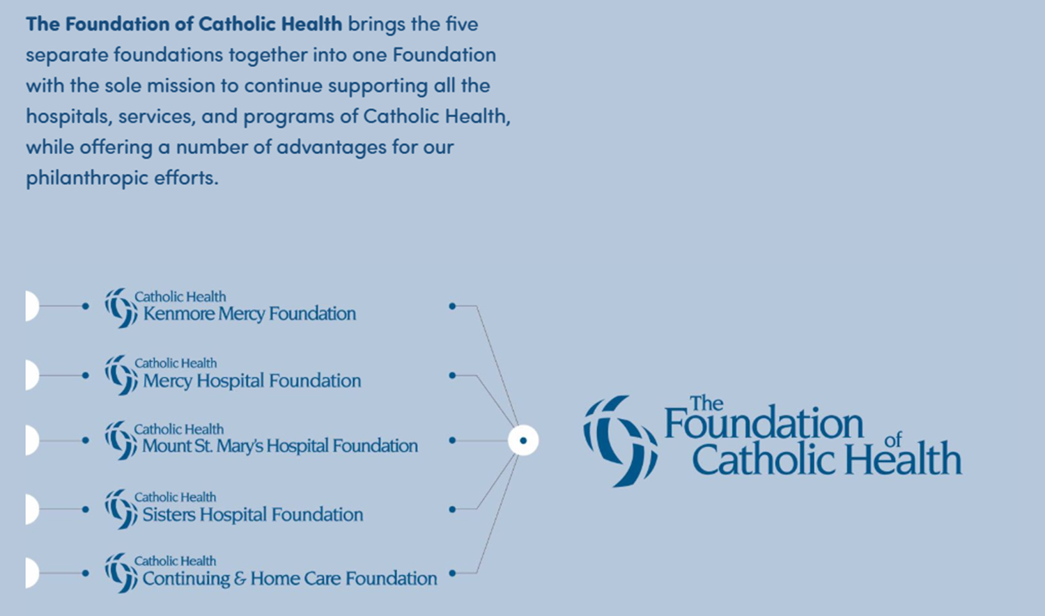 The foundations that are merging are Continuing Care Foundation, Kenmore Mercy Foundation, Mercy Hospital Foundation, Mount St. Mary's Hospital Foundation, and Sisters Hospital Foundation.