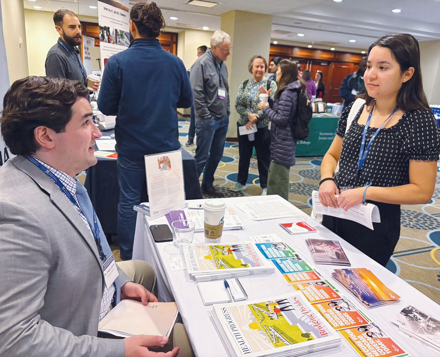 Joe Lepore, CHA government relations associate, discusses the work of the Catholic health care ministry with a college student who stopped by the association's table in the exhibit hall of the gathering.