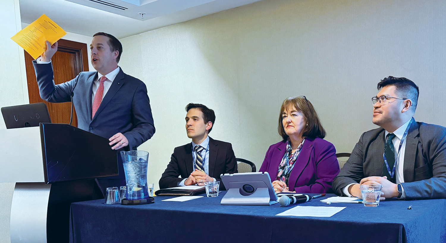 From left, Lucas Swanepoel, Robert Vega, Kathy Curran and Paulo Pontemayor lead a workshop on public policy related to health care at the Catholic Social Ministry Gathering. Swanepoel, Curran and Pontemayor are part of CHA's advocacy staff. Vega directs public policy at the Secretariat of Pro-Life Activities at the United States Conference of Catholic Bishops.