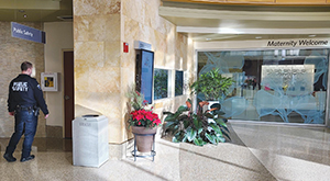 One of the zones is the hospital's parking areas. To patrol them, the security team added a cruiser that looks like those used by police. The officer driving it keeps its blue and red lights on, but not flashing. Rennier says that before those patrols began, cars on the hospital lots were frequent targets of burglars. In the last two years there has only been one car burglarized and it was an unlocked vehicle.