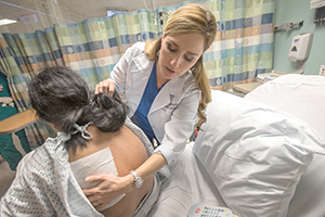 LaPietra checks in on one of her patients, Dilia Lascarro Nieto of Garfield, N.J., who came to the ER complaining of chest pain and back pain. LaPietra started her on acetaminophen, an anti-inflammatory and a lidocaine patch, which numbed her back pain. LaPietra said these medications "get to the root of" the patient's pain, without the sedating effects of an opioid that can compromise a patient's breathing.