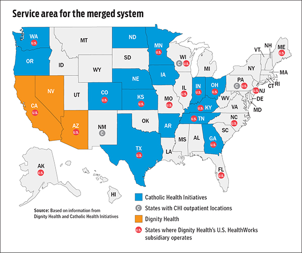 CHI and Dignity Health said combining their organizations will give them a stronger operational and financial foundation and a larger footprint. There is no overlap in the two systems' hospital service areas, although in 12 states, there is some overlap between CHI's hospital or non-acute service areas and areas where Dignity Health provides non-acute services. A Dignity Health spokesperson said Dignity Health's U.S. HealthWorks subsidiary operates occupational health and urgent care centers in 21 states.
