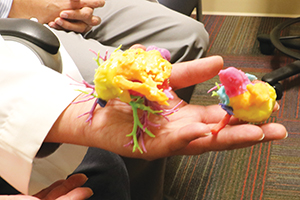 The printer used for Conner's modeling is about 55 inches by 50 inches by 43 inches. Physicians and a technician upload a patient's 2-D scans into software that makes precision measurements and directs the printer to extrude resin layer by layer to make an exact replica. Assorted colors are used to differentiate parts of an organ or of the surrounding anatomy. The models are slightly pliable. A 3-D model usually takes between 10 and 20 hours of printing time to manufacture.